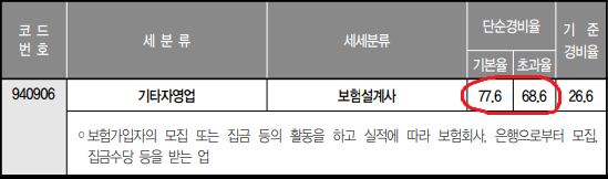 보험설계사의 수수료수입(매출)이 연 7500만원 이하인 경우, 필요경비에 단순 경비율이 적용됩니다. 여기서 4000만원 이하는 단순경비율 77.6%를 적용, 4000만원 초과~7500만원 이하는 68.6%를 경비로 인정합니다. 예를들어 연 매출이 7500이라고 하면, 7500만원 중 5505만원(4000만*77.6% + 3500만*68.6%)을 경비로 인정하고, 나머지 1995만원을 소득으로 인정한다는 것입니다.
