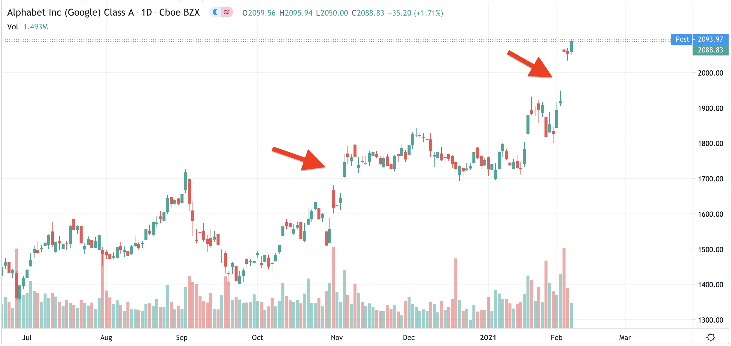 알파벳 주식을 한번 볼까요? 크고 작은 갭이 많이 있지만 일봉에서 봤을 때 주목해야 하는 곳은 이 두 곳입니다.